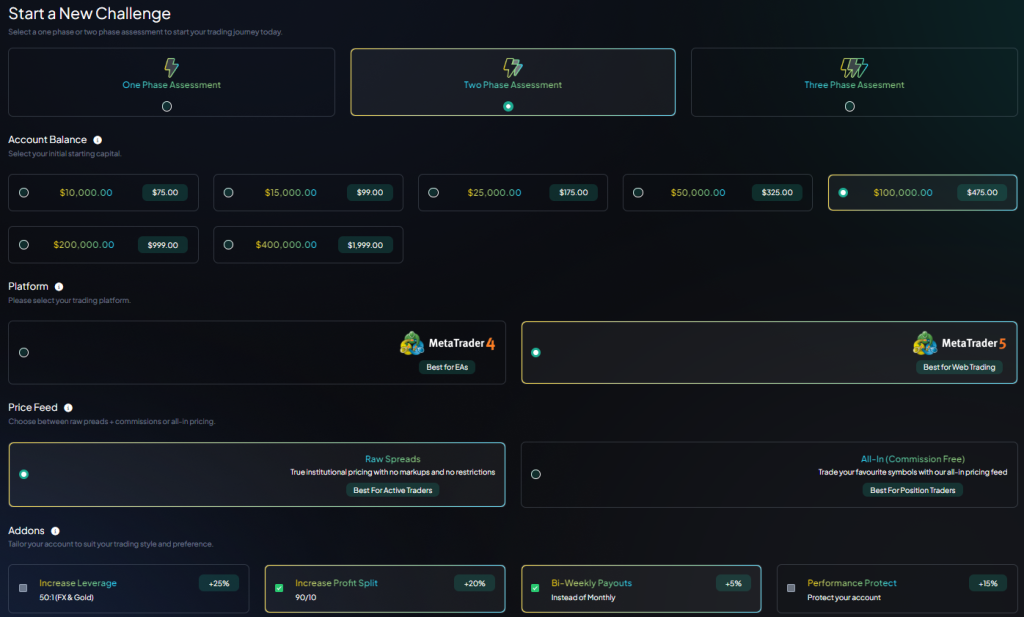Choose Your Account – Choose your account type, account size, trading platform, price feed type, and add-ons.