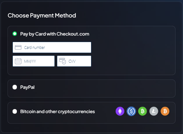 Choose Your Payment Method – Choose between a credit/debit card, PayPal, and cryptocurrency payment methods.
