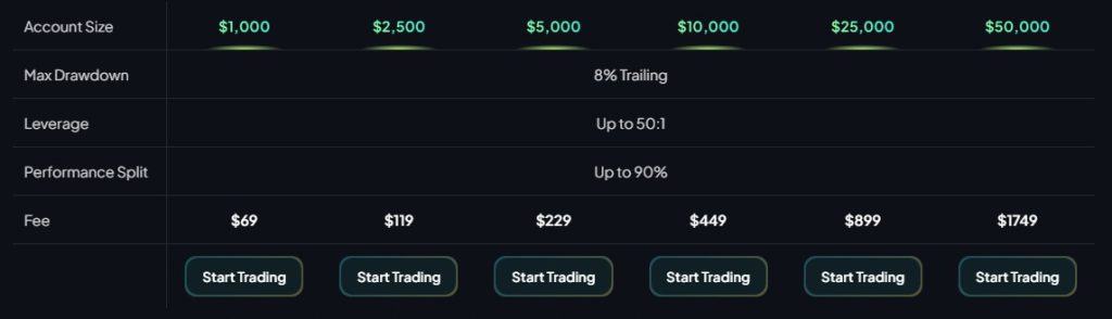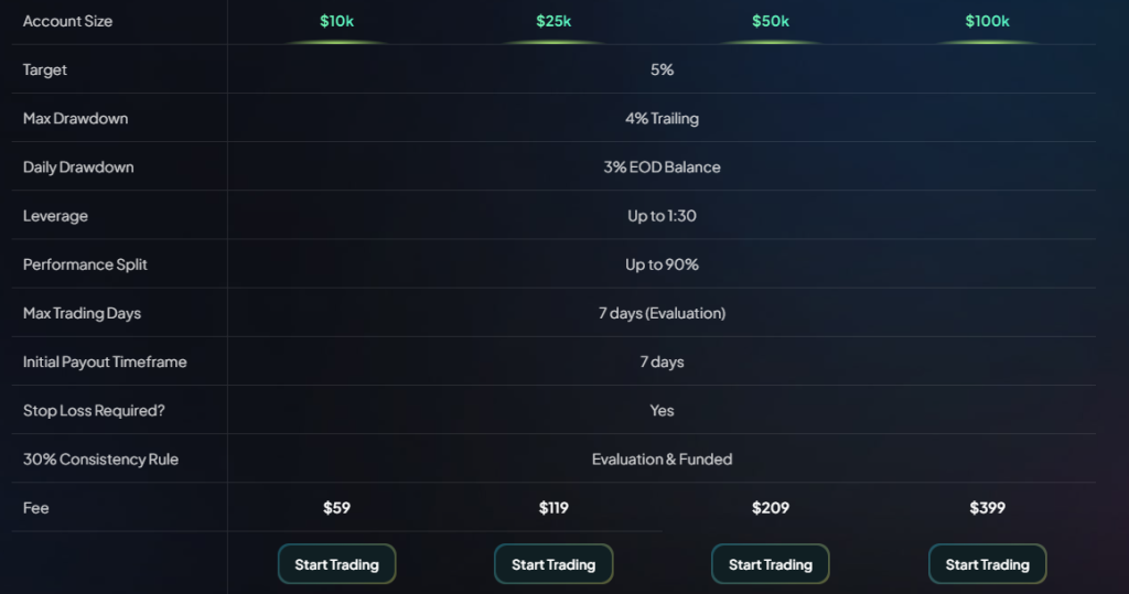 FXIFY’s Lightning Evaluation provides traders the opportunity to manage account sizes ranging from $10,000 up to $100,000. The aim is to identify talented traders who are profitable and can efficiently manage risk throughout the one-step evaluation period. The Lightning Evaluation allows you to trade with up to 1:30 leverage